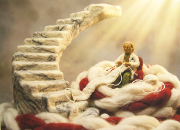 Picture 3: STATURE: A tiny figure knits inside a great wool staircase – the path and the making are one thing. The most intimate image in the series.