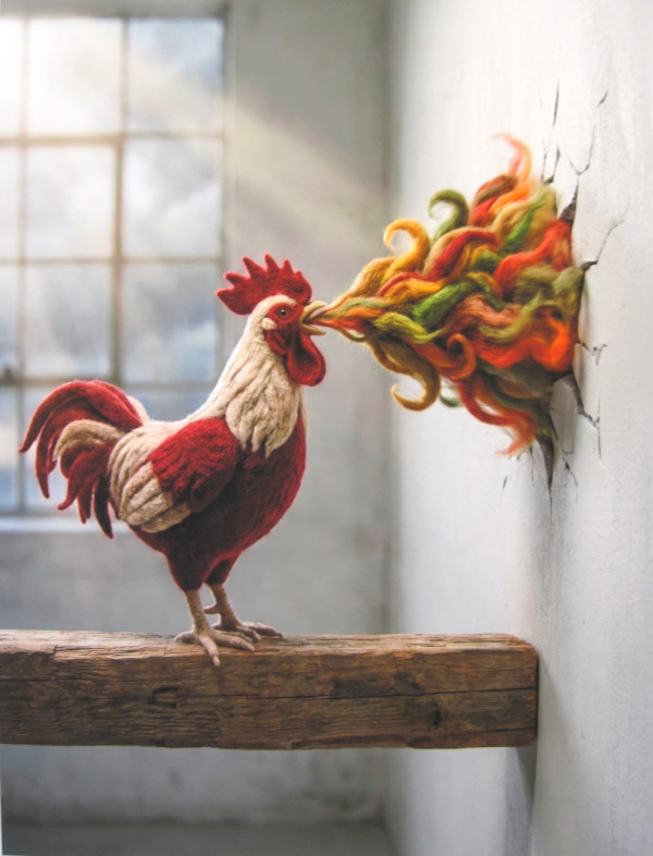 Picture 4: AWAKENING: A felted rooster breathes coloured wool into the plaster – cracking it, flowering through it. A new view om psychiatry. The loudest image in the series.