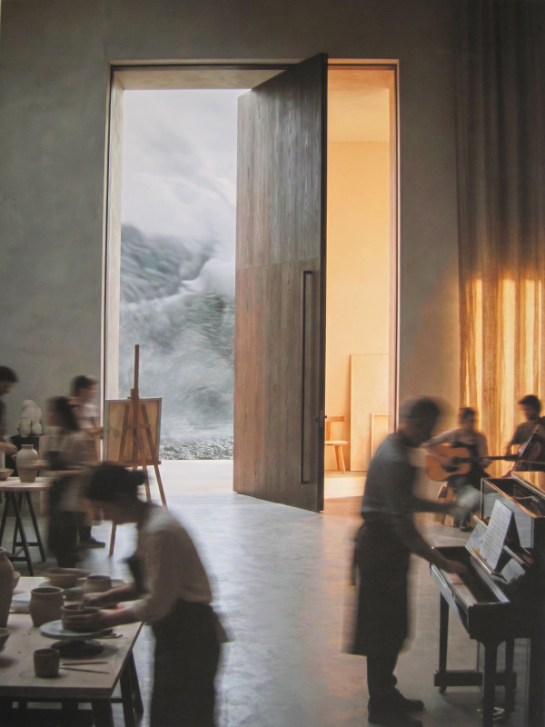 Picture 1: TRESHOLD: A door wide open onto a churning grey sky; inside, potters, musicians and figures move through warm life. The hinge betweeen crisis and contribution.