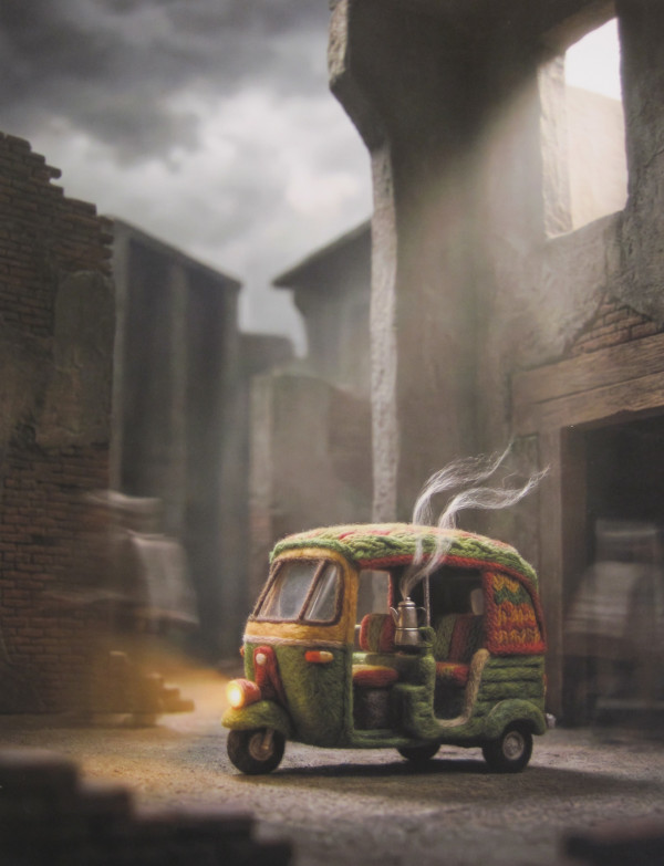 Picture 2: RUBY: A wool-wrapped tuk-tuk navigates ruins lit by a single beam – growth as structured chaos, care applied by human hands to something mechanical.